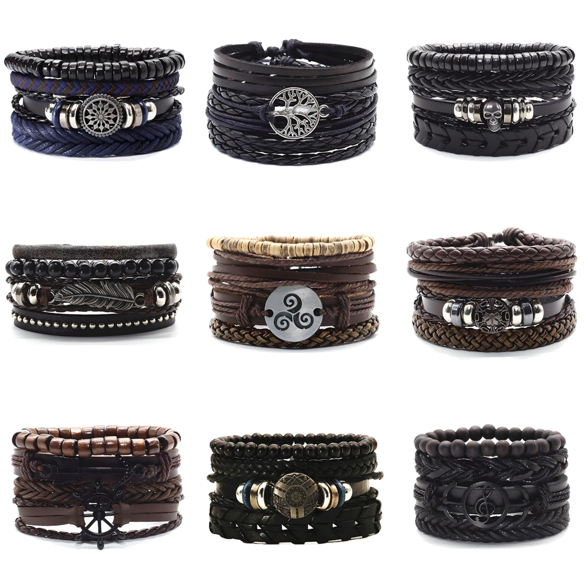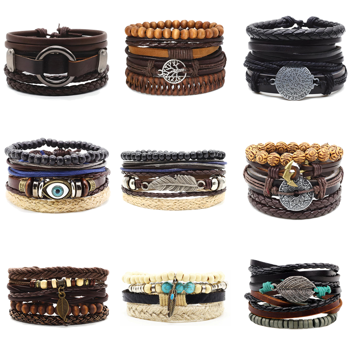 Nuestras pulseras están hechas de cuerda de cuero trenzado, tela de cáñamo, cuentas de madera y acero inoxidable.